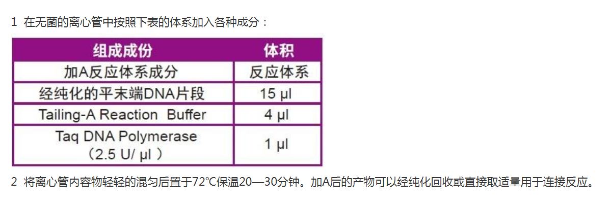 加A反應液適於 pfu 等高保真DNA聚合酶擴增後的平末端片段 3’端的加 A反應,從而利於片段與3’端帶T末端載體的連接。
