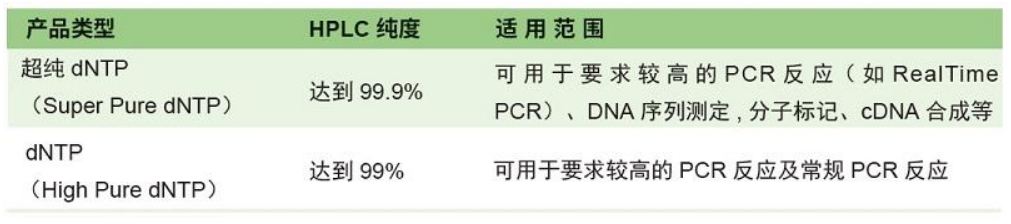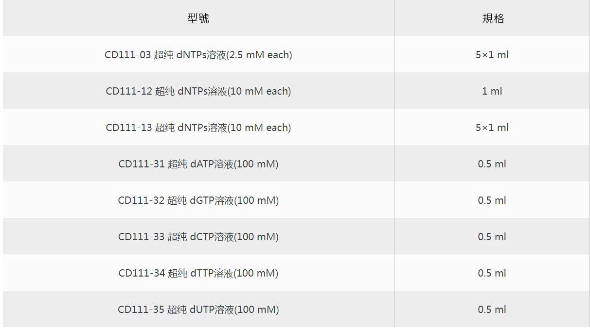 ■ 超純dATP/dGTP/dCTP/dTTP/dUTP(100 mM each): 是單組分的高濃度去氧核糖核苷酸溶液,按實驗需要,稀釋至適當濃度與其他dNTPs混合後使用。