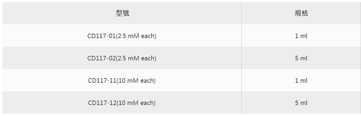 ■ 超純 dNTP /dNTPs (2.5 mM each) :是 dATP、dGTP、dCTP、dTTP 的等摩爾混合物,可作為 DNA 聚合酶的底物使用。 進行 PCR 反應時,不用稀釋即可直接使用。用於 PCR 的標準使用量是每 100 µl 反應液用 8 µl(終濃度為各 200 µM)。
