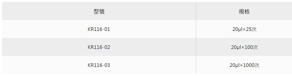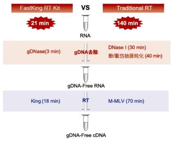 本試劑盒是一種高效、穩定、快速並可以去除基因組 DNA 污染的反轉錄系統。 本試劑盒含有高效去除基因組 DNA 的 gDNase, 有效避免 Total RNA 中基因組 DNA 的干擾; 高效反轉錄酶 FastKing RT Enzyme 是通過分子改造後的新型反轉錄酶,特別增加了疏水 motif,具有更強的 RNA 親和性和熱穩定性,從而進一步提高了其反轉錄效率和反應速率,並使其在通讀 GC 含量高、二級結構複雜的 RNA 範本和抗逆性等方面的表現也更為的突出。