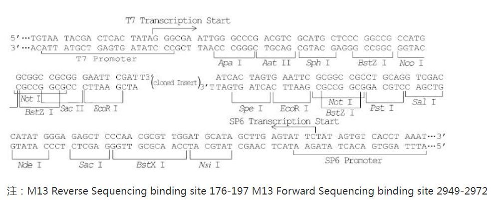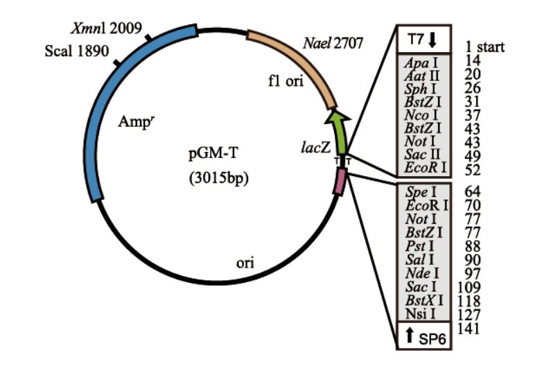 pGM-T是高效克隆 PCR 產物的專用載體,由克隆載體改建而成,使多克隆位點兩側的 3’端帶 T。由於大部分耐熱聚合酶反應時都會在 PCR產物的 3’端添加一個 A,可與 pGM-T 載體 3’端的T互補連接,同時 3’T突出端可以防止載體的自身環化,因此可大大提高PCR產物的連接和克隆效率。pGM-T載體包含有T7和SP6 RNA聚合酶啟動子,其側端和多克隆位點區相接,多克隆位點區位於β半乳糖苷酶的α肽編碼區內。α肽插入失活使得菌落在指示培養基中呈現不同顏色,可根據顏色直接篩選重組克隆,白色克隆為陽性重組克隆,藍色的為載體自連的克隆 (具體篩選原理見分子克隆第三版)。