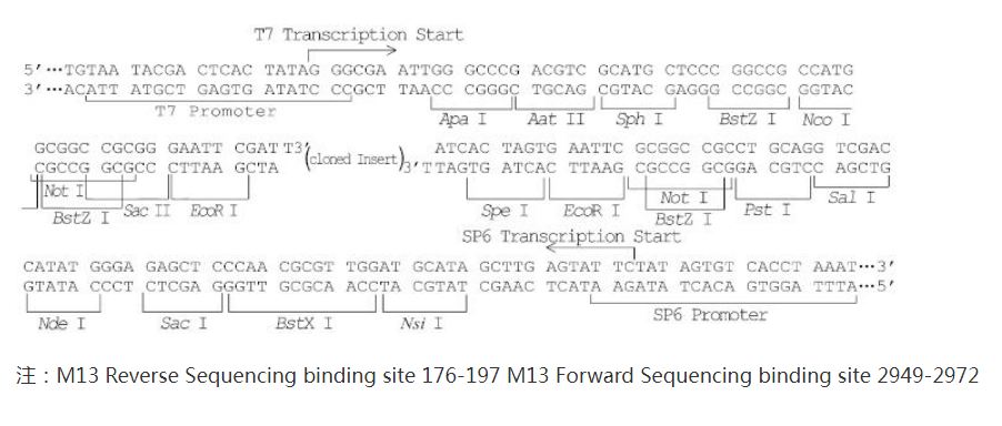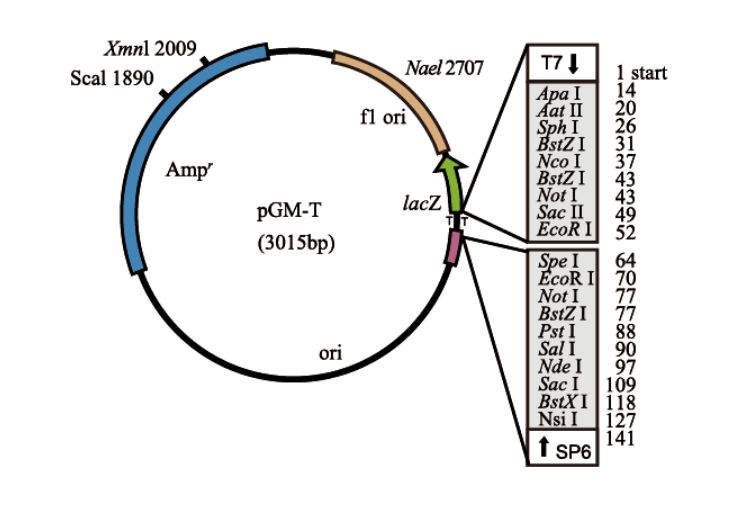 pGM-T是高效克隆 PCR 產物的專用載體,由克隆載體改建而成,使多克隆位點兩側的 3’端帶 T。由於大部分耐熱聚合酶反應時都會在 PCR產物的 3’端添加一個 A,可與 pGM-T 載體 3’端的T互補連接,同時 3’T突出端可以防止載體的自身環化,因此可大大提高PCR產物的連接和克隆效率。pGM-T載體包含有T7和SP6 RNA聚合酶啟動子,其側端和多克隆位點區相接,多克隆位點區位於β半乳糖苷酶的α肽編碼區內。α肽插入失活使得菌落在指示培養基中呈現不同顏色,可根據顏色直接篩選重組克隆,白色克隆為陽性重組克隆,藍色的為載體自連的克隆 (具體篩選原理見分子克隆第三版)。