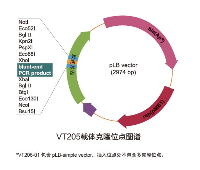pLB 零背景快速克隆試劑盒是一種陽性選擇克隆系統。試劑盒提供一種新穎的即用型陽性選擇克隆載體 pLB,該載體含有致死基因,多克隆位點處插入外源片段會導致該基因失活,而自身環化的 pLB 載體則會表達致死的毒性蛋白。因此,轉化後只有含有重組質粒的細菌才能存活形成克隆菌落,從而無需藍白斑篩選。克隆位點兩端均包含Bgl Ⅱ酶切位點,可進行單酶切鑒定陽性克隆。