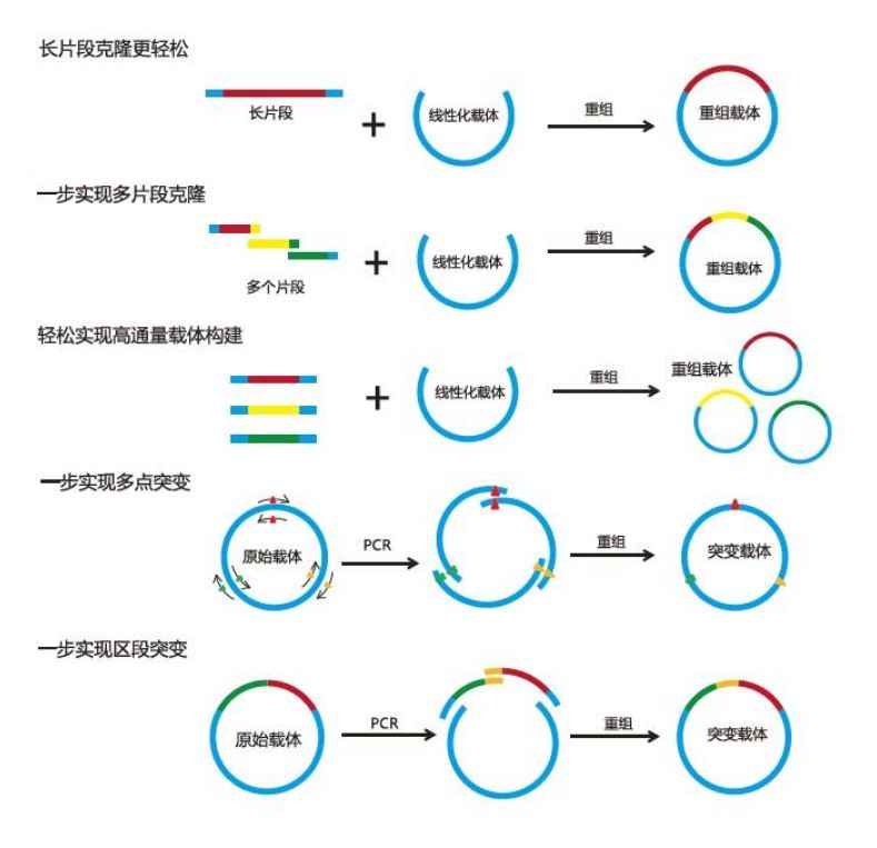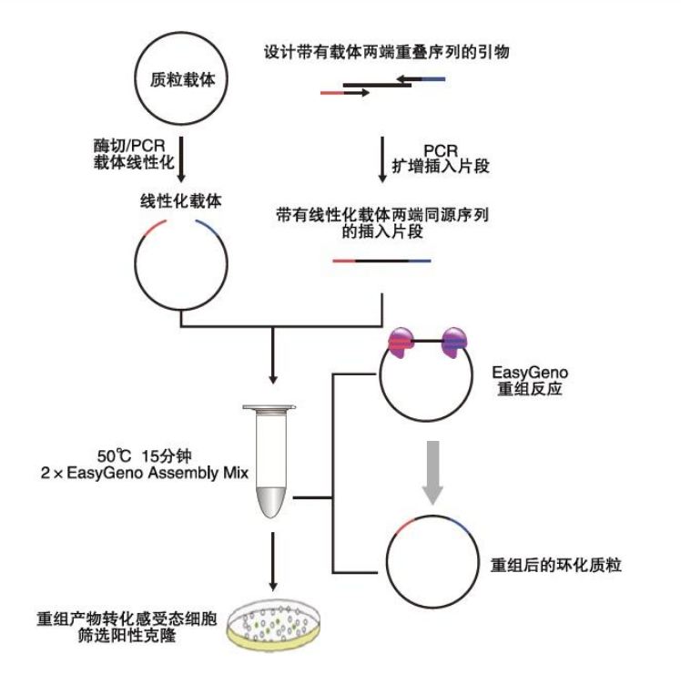 EasyGeno 重組試劑盒基於DNA序列同源性進行片段重組,可快速將單個或多個片段定向克隆到任意載體中。精心設計的一管式預混試劑2×EasyGeno Assembly Mix可將線性化的載體和插入DNA片段在同源區域進行重組連接,得到無缺口的閉環質粒,繼而直接轉化感受態細胞並篩選克隆。該方案擺脫了酶切位點的限制,僅需通過PCR在插入DNA的兩端加入線性化載體15 bp的一致性序列,即可實現目的片段定向重組進入載體。重組反應可在恒溫條件下快速進行 (50℃處理 15 min),並能保證所得陽性率在 95% 以上。本試劑盒還能夠實現多目的片段同時定向重組進入載體以及高通量的載體構建。