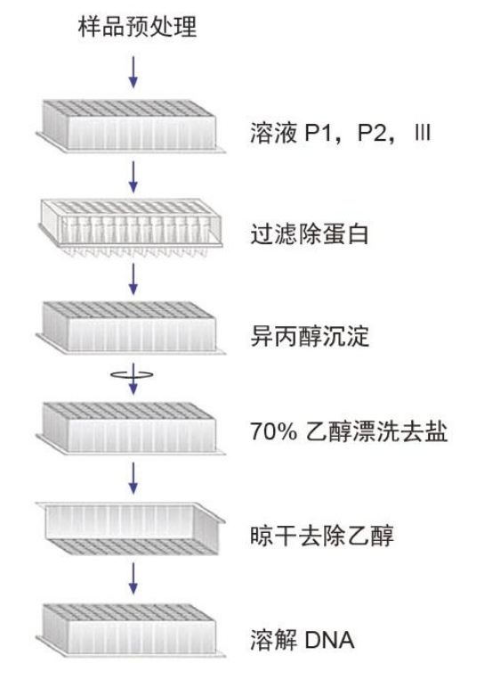 該試劑盒通過異丙醇沉澱的原理純化得到質粒 DNA。本試劑盒採用本公司特製的96孔過濾板和溶液 III 能夠快速高效的提取到高純度的質粒 DNA。適用于高通量質粒的快速製備,每孔處理 1.3 ml 高拷貝質粒菌液,快速完成96個樣本的質粒 DNA 提取,每孔最大產量為 10-20 μg(產量與質粒拷貝數、細菌狀態等因素有關)。