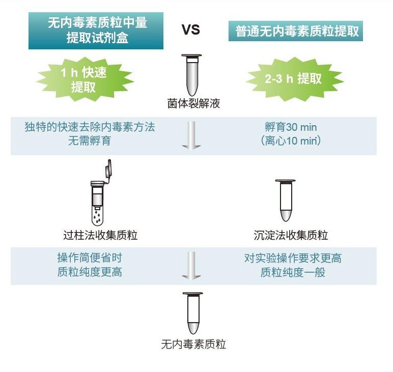 本試劑盒採用獨特的矽膠膜吸附技術,高效專一地結合質粒 DNA。 同時採用特殊的溶液 EBT 和篩檢程式 CS1,可有效的去除內毒素、 蛋白等雜質;整個提取過程僅需 1 h,方便快捷。