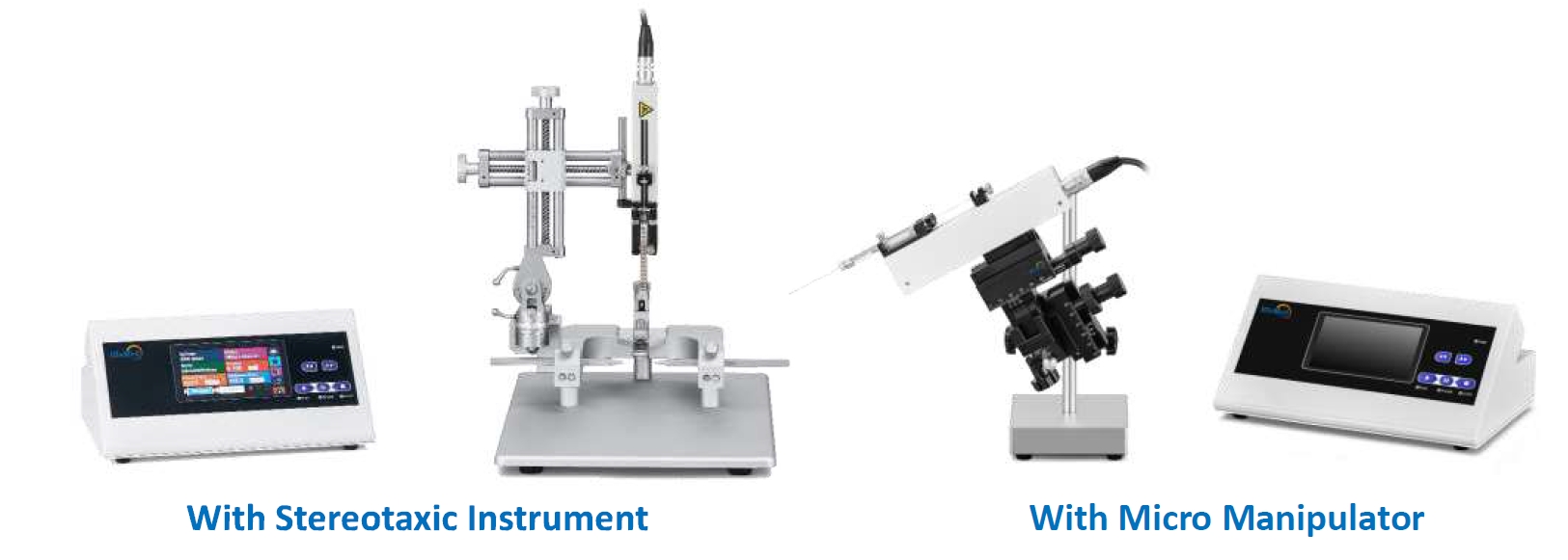 - 分離式泵頭輕量化(0.25公斤),能與立體定位儀、微操作器等配合使用。