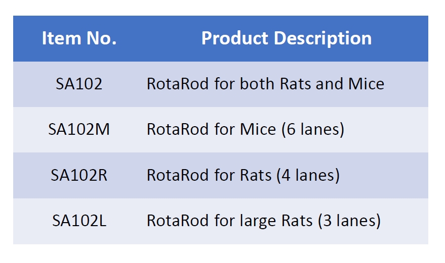 RotaRod 主要用於動物的運動協調性、平衡測試、抗疲勞藥物篩選和識別測試,作為評估小鼠和大鼠運動表現的有效工具,利用其對自然墜落的恐懼作為動力來進行測試。當動物從轉棒部分墜落到下方的平板時,會記錄時間和墜落時的轉棒速度。