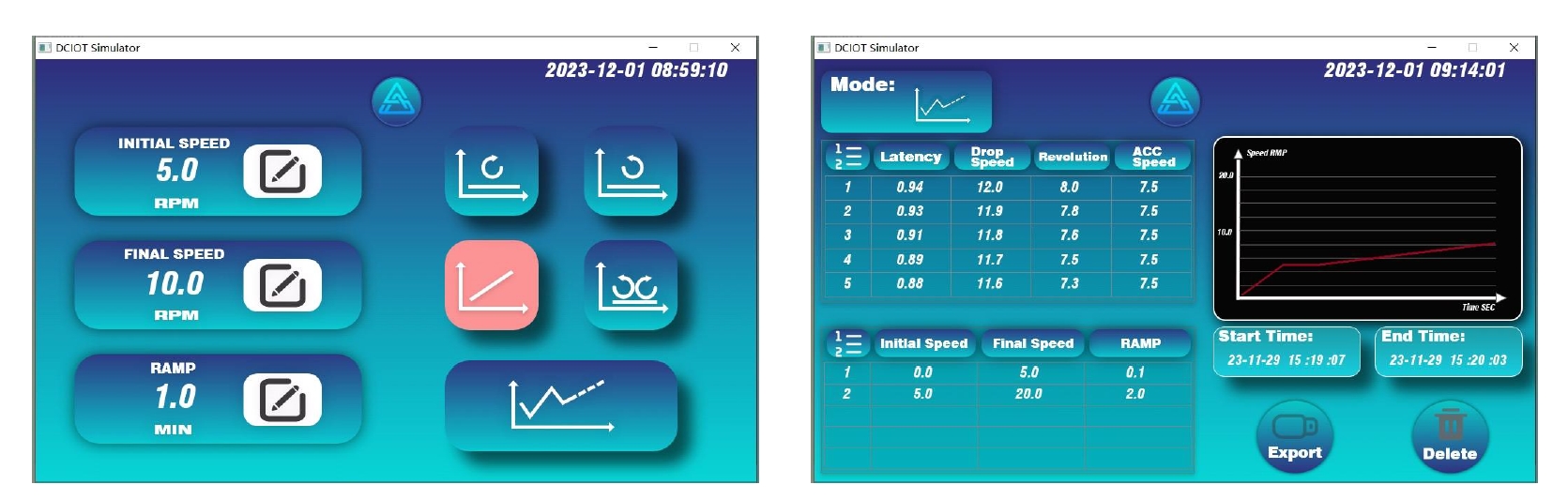 - 恆定加速度,可調節,範圍:0-100r/min²。