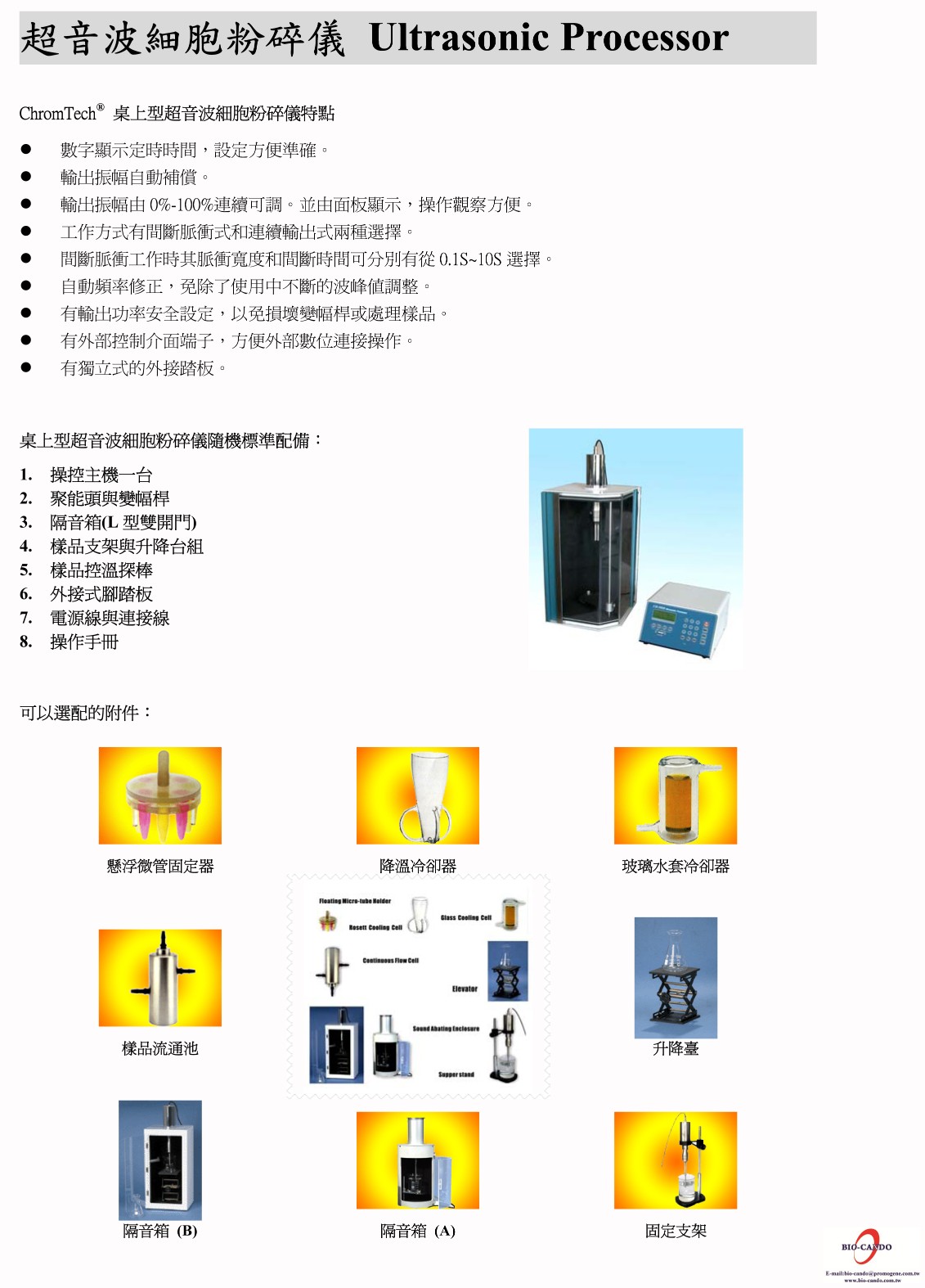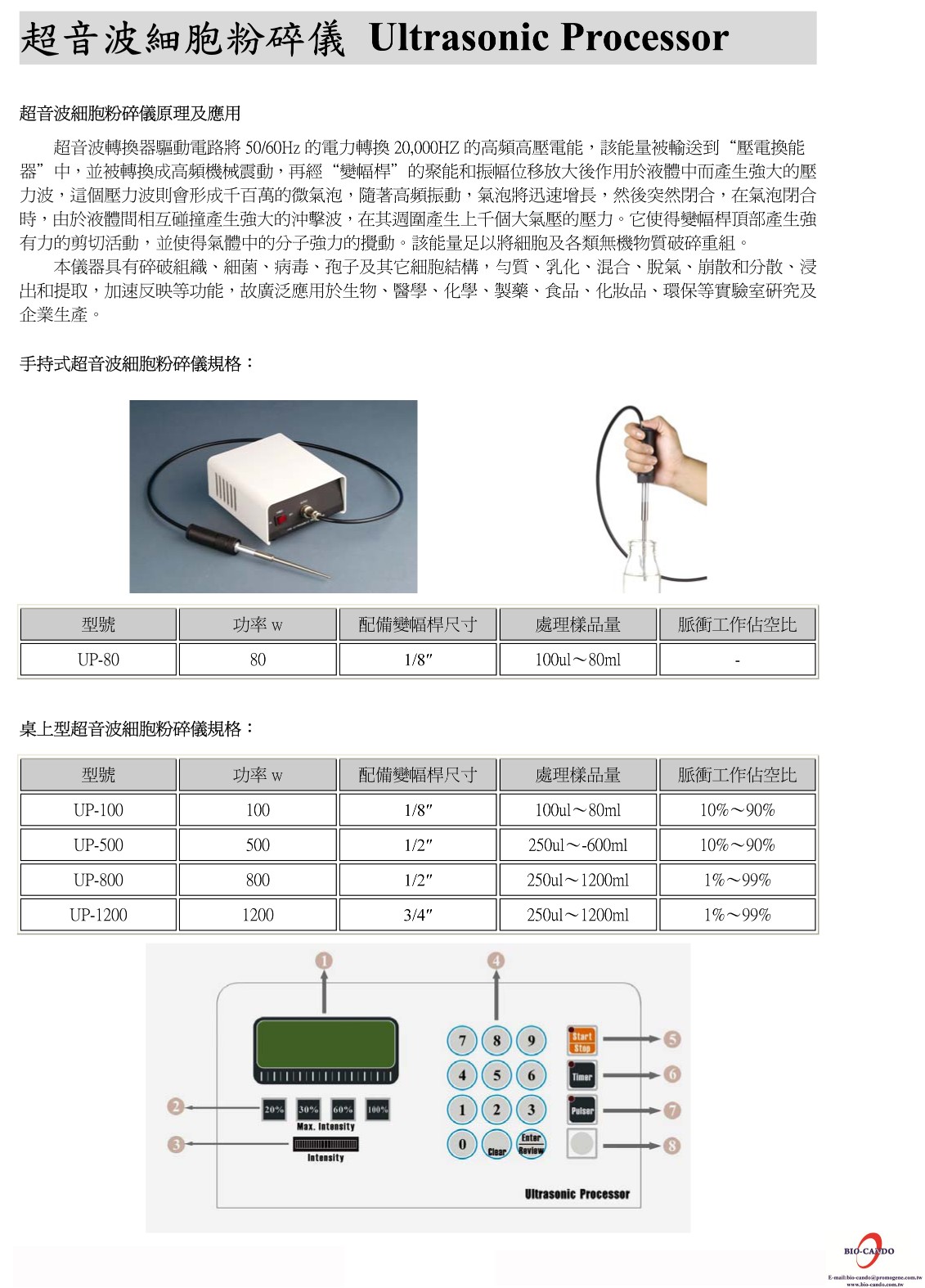 超音波細胞粉碎儀 Ultrasonic Processor 首頁 產品介紹 實驗室儀器設備 f.其他 超音波細胞粉碎儀 Ultrasonic Processor 超音波細胞粉碎儀中變幅桿頂部產生強有力的剪切活動,並且氣體中的分子強力的攪動產生大能量,此能量足以將細胞及各類無機物質破碎重組具有碎破組織、細菌、病毒、孢子及其它細胞結構,勻質、乳化、混合、脫氣、崩散和分散、浸出和提取,加速反映等功能,故廣泛應用於生物、醫學、化學、製藥、食品、化妝品、環保等實驗室研究及企業生產。 商品介紹