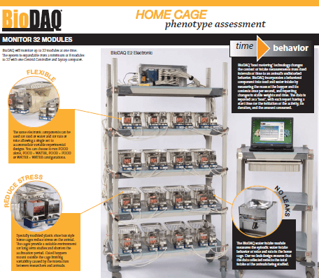 BioDAQ 小動物飲食飲水自動測量系統 首頁 產品介紹 動物實驗設備、用品 d.手術監控、代謝生理數值監測 BioDAQ 小動物飲食飲水自動測量系統 BioDAQ 是一套飲食飲水自動量測系統,可以讓動物在不被打擾的狀況下,紀錄動物的攝食行為,並且省去人力計算的麻煩。 Food & Water Intake Monitor for Rats and Mice