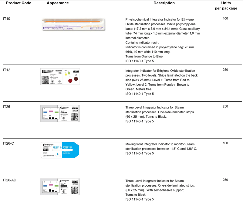 化學滅菌確效指示劑 (指標式) 首頁 產品介紹 實驗室儀器設備 e.滅菌消毒相關 化學滅菌確效指示劑 (指標式) Terragene生物指示劑及化學指示劑廣泛應用於製藥廠及醫療機,用於檢測蒸氣,低溫甲醛蒸氣,過氧化氫,氧化乙烯氣等殺菌過程,產品生產嚴格遵守IRAM / GMP / ISO。 此類的化學指示劑應用在EO滅菌、蒸氣滅菌,滅菌完成後試劑表面會有顏色區分或者有指定的刻度範圍,當具有顏色的條狀液在accept範圍內即代表滅菌完成;反之,若落在reject範圍及代表沒有完全滅菌。 商品介紹 Integrators and emulators