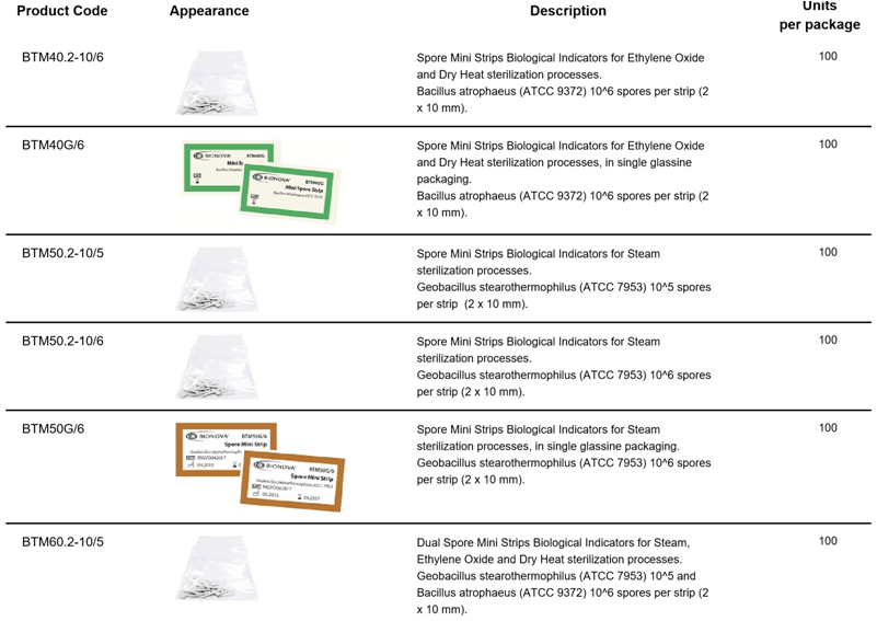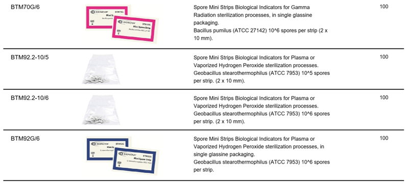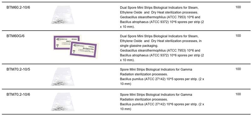 生物滅菌確效指示劑 (Mini 紙片式) 首頁 產品介紹 實驗室儀器設備 e.滅菌消毒相關 生物滅菌確效指示劑 (Mini 紙片式) Spore Strips 為迷你型條狀指示劑,提供指示劑尺寸、培菌種與菌數,是一種便利型生物指示劑 滅菌方式包含: 蒸氣滅菌、過氧化氫(H2O2)滅菌、gamma滅菌、Ethylene Oxide(EO)滅菌、乾熱滅菌、plasma滅菌等多項滅菌方式 Terragene生物指示劑及化學指示劑,廣泛應用於製藥廠及醫療機構。用於檢測蒸氣、低溫甲醛蒸氣、過氧化氫、氧化乙烯氣等殺菌過程,且產品生產嚴格遵守 IRAM / GMP / ISO * 歡迎來電洽詢 * 商品介紹 Biological Indicators (Spore Mini Strips)