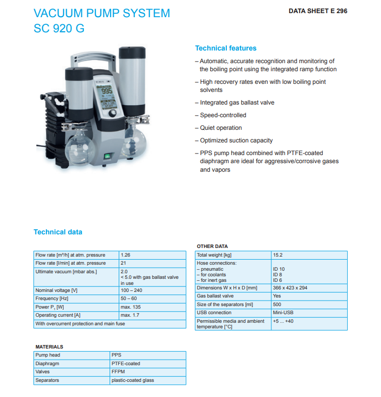 一般的 6-8 mbar 系統在處理 DMSO (二甲基亞碸)、DMF (二甲基甲醯胺) 或乙二醇等高沸點溶劑時非常吃力,往往需要加熱到很高溫。SC 920 G 的 2 mbar 深度能顯著降低這些溶劑的沸點,在較低溫度下即可快速完成濃縮。