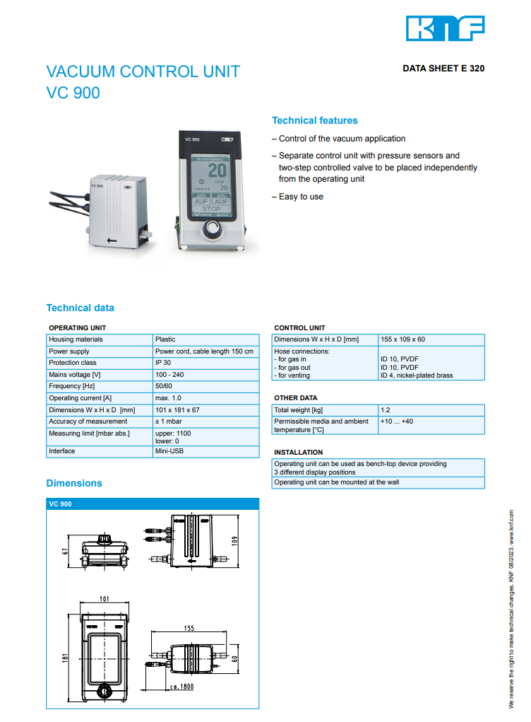 VC 900 的設計核心在於提供直觀、精確且耐用的壓力管理方案,特別適合與 KNF LABOPORT® 系列隔膜幫浦搭配使用。