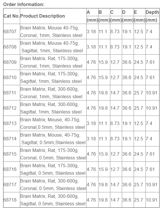 RWD腦切片盒 首頁 產品介紹 動物實驗設備、用品 b.神經科學 RWD腦切片盒 RWD Brain矩陣採用不銹鋼材料,經過精密加工和高度拋光,耐用性強,可加熱,冷藏,高壓滅菌,可在各種惡劣條件下使用。有冠狀切面和矢狀切面,每個切面均可薄為0.5毫米或1毫米。廣泛用於製備病理組織切片和切除TTC染色組織。