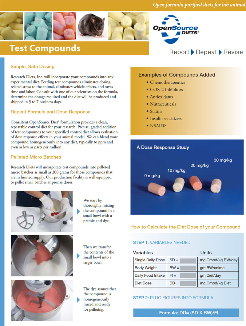 化合物飼料 首頁 產品介紹 實驗動物飼料 h.加藥、客製化、自配飼料原料、其他 化合物飼料 商品編號:P111011003301 商品規格:2.5Kg / 箱 商品簡介:Research Diets公司可使用您的化合物調配出實驗的飼料。利用餵養試驗化合物的方式,消除傳統灌食給予動物的壓力,並節省時間和勞力的付出。研究人員需確定劑量多寡,飼料將於會於3到4週內提供給研究人員。Research Diets公司為你的研究飼料提供了一個乾淨、精確且具有重複的飼料。此外,將測試化合物分成不同的劑量,可以在動物實驗的模式中去評估不同劑量反應的效果。我們可以均勻混合調配成任何飼料,通常以ppm甚至ppb調配。 商品介紹: