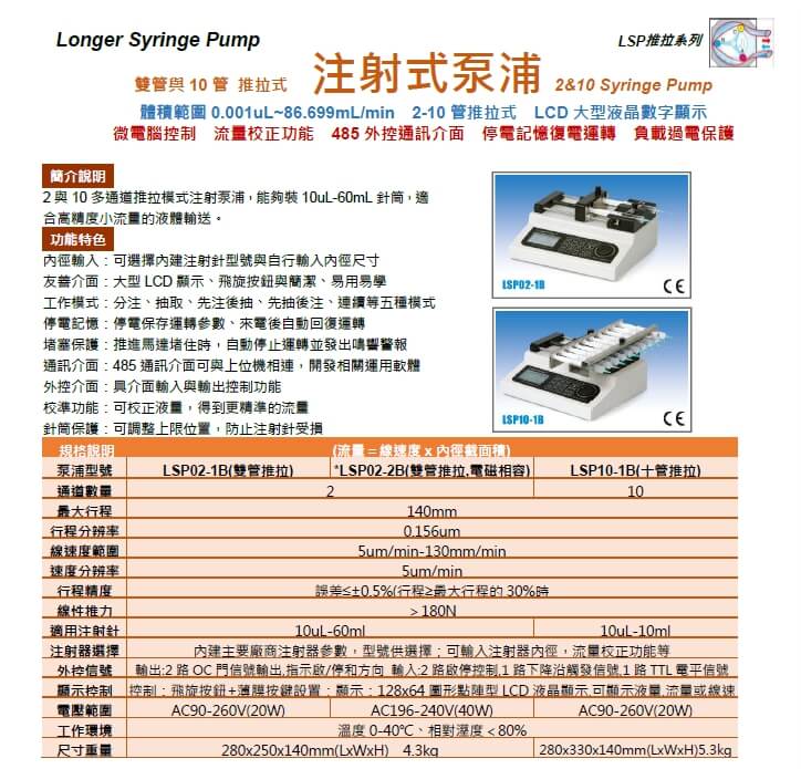 Longer Syringe Pump微量注射器(幫浦)/微量注射針有LCD大螢幕觸控面板與飛旋按紐,操作簡單、快速,其工作模式有:分注、抽取、先抽後注、連續等五種模式,停電時會先寶吋運轉參數,來電後自動回覆運轉,若推進馬達堵塞,會自動停止運轉並發出聲響警報。Longer Syringe Pump 微量注射器(幫浦)/微量注射針的針筒保護功能可調整上限位置,防止注射針受損,是您實驗中的優質好幫手!