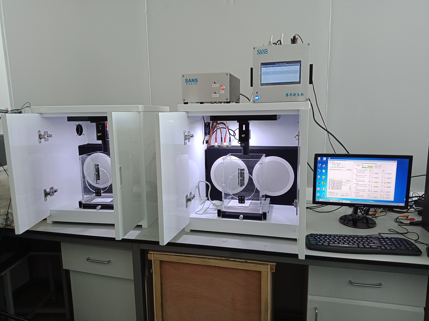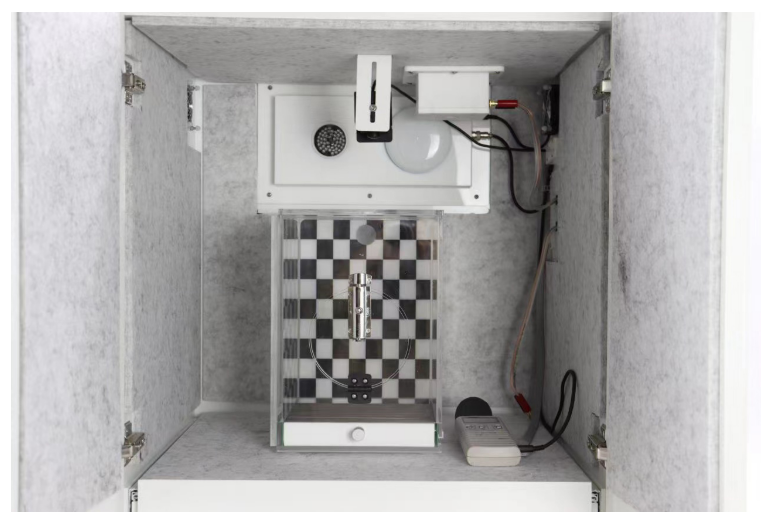 隔音箱配置: 包含揚聲器、LED燈、鼠籠試驗箱、風扇、紅外燈。